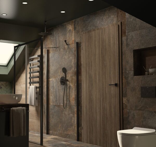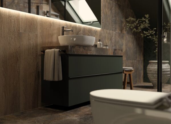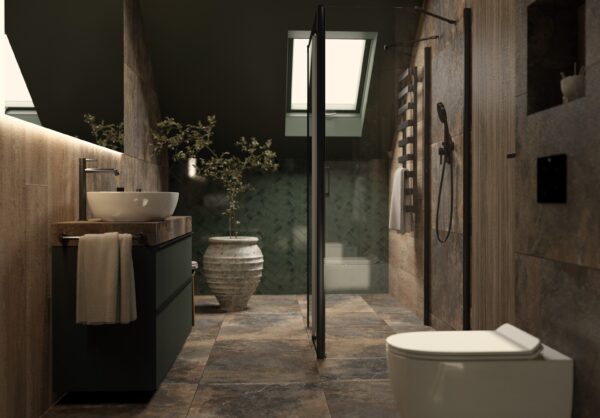 Ta wyjątkowa wizualizacja łazienki łączy surowość industrialnych materiałów z ciepłymi, naturalnymi akcentami i odważnymi detalami kolorystycznymi. Zarówno na ścianach, jak i podłodze zastosowano Rondine Multicolor Lappato 60×120 – płytki imitujące zardzewiały beton. Ich chropowata, matowa powierzchnia wprowadza industrialny klimat, a nieregularne rdzawobrązowe tony dodają wnętrzu głębi i niepowtarzalnego charakteru. Betonowe płytki podkreślają nowoczesną stylistykę, wprowadzając równocześnie surowość do przestrzeni.
