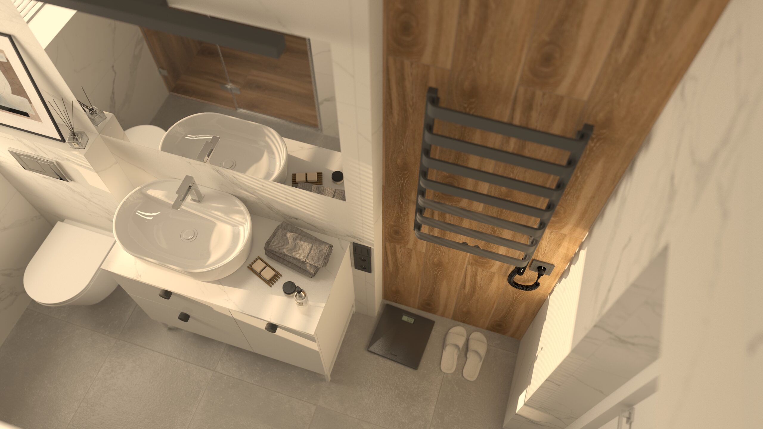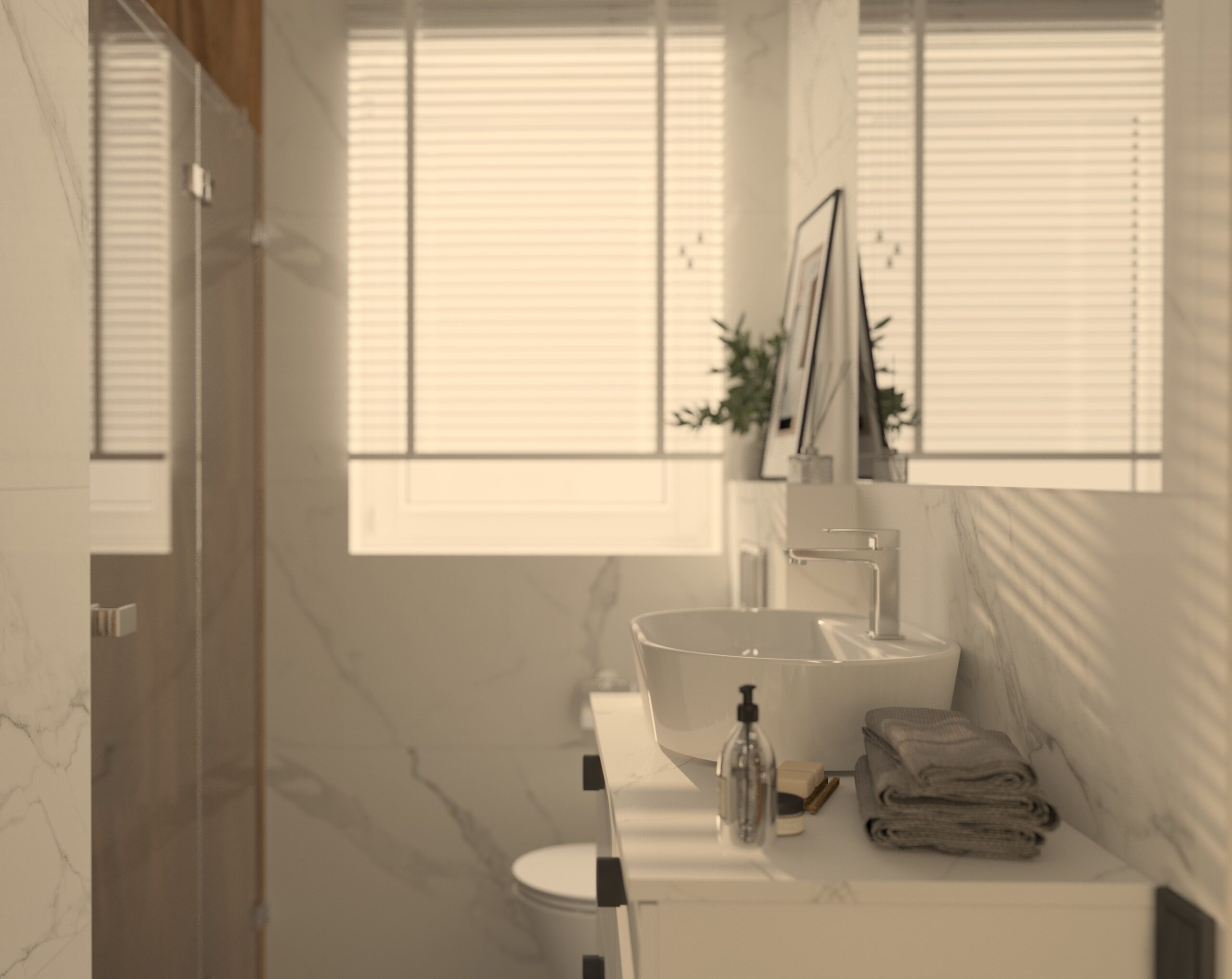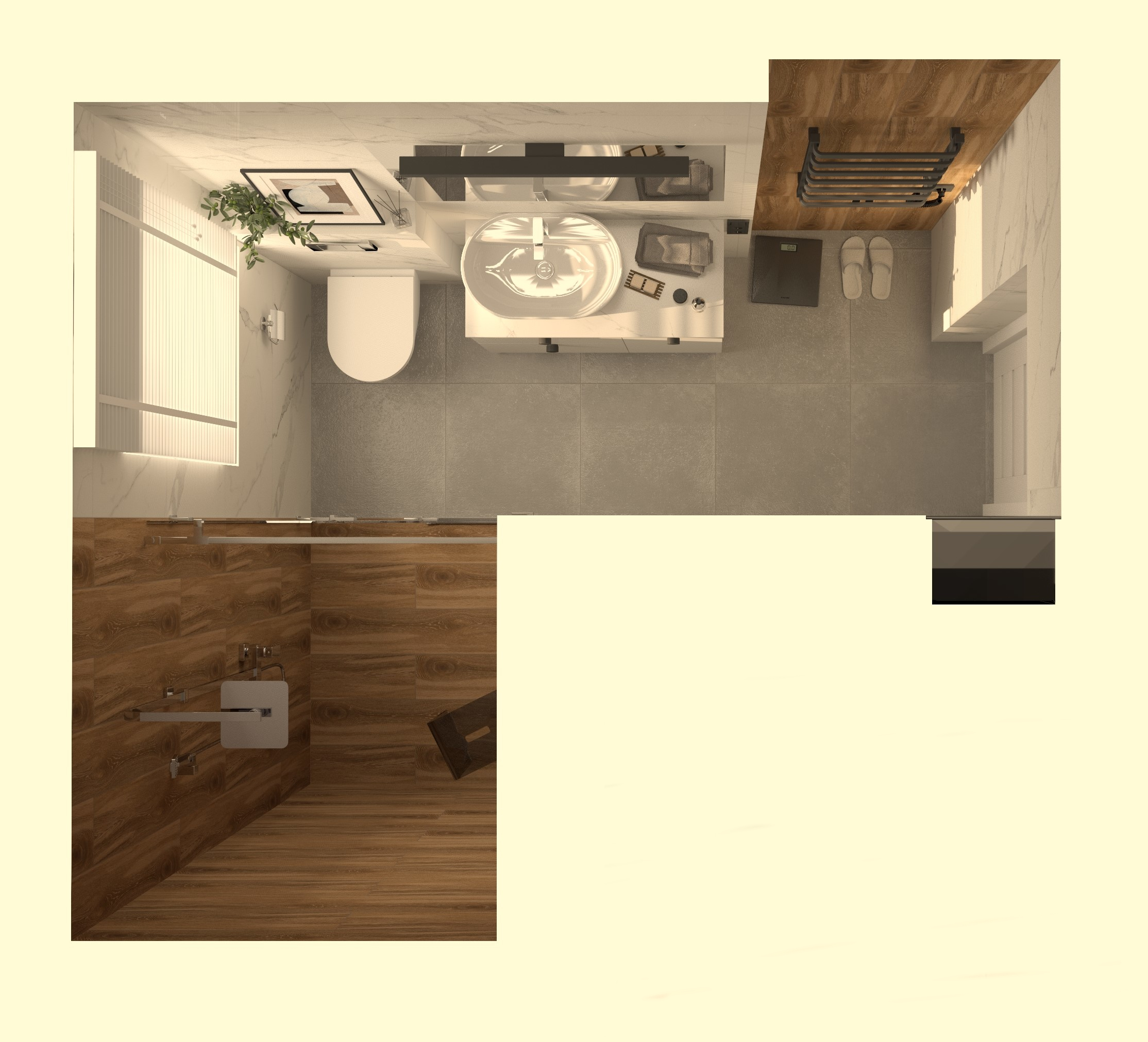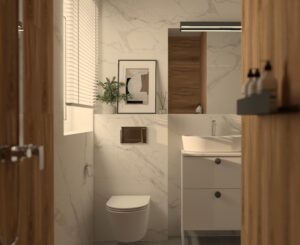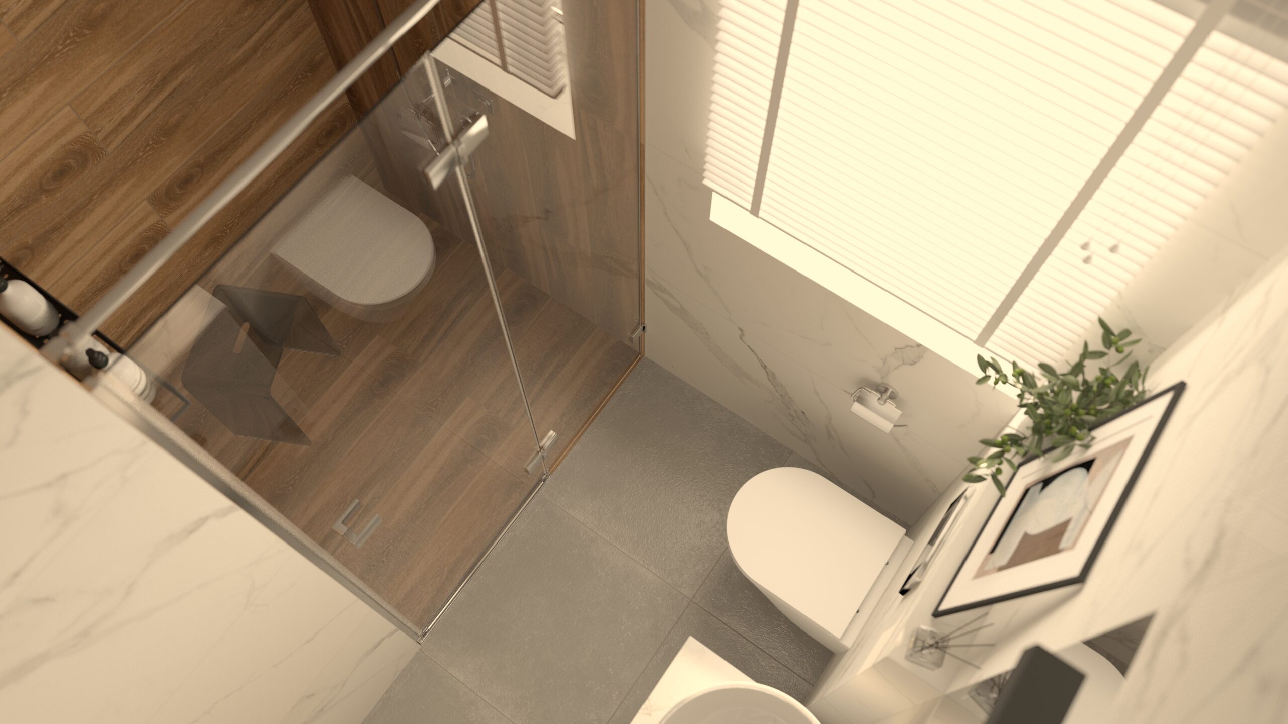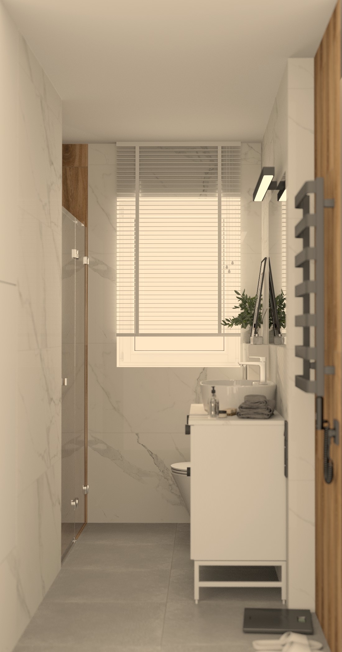 Wizualizacja przedstawia przytulną i funkcjonalną łazienkę, w której dominują stonowane kolory i przemyślany układ, idealny dla niewielkich przestrzeni. Naturalne światło wpada przez małe okno, subtelnie oświetlając wnętrze i podkreślając jego elegancję. Ściany zdobią płytki Porcelanosa Ruggine Platino, których matowo-błyszczący szary metaliczny efekt nadaje przestrzeni nowoczesności i subtelnego połysku.... Czytaj dalej