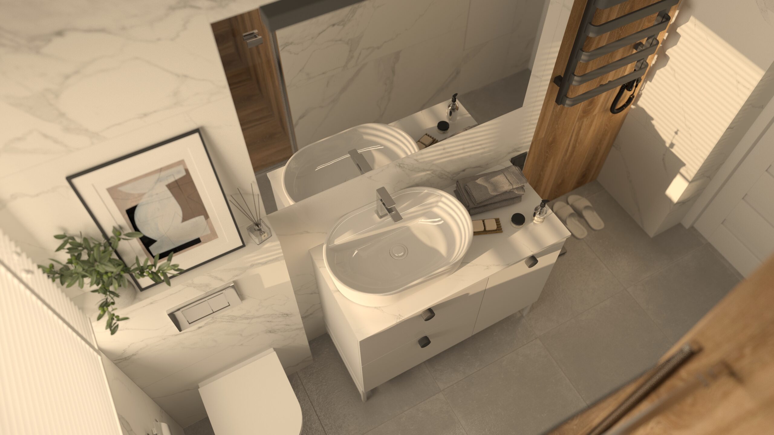Ciepły minimalizm w łazience – piaskowy beż i wielkoformatowe płytki Porcelanosa