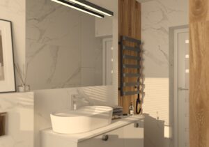 Wizualizacja przedstawia kolorową, radosną łazienkę, idealną dla dzieci, ale również doskonałą dla dorosłych, którzy cenią sobie żywe i pełne energii wnętrza. Przestrzeń łączy w sobie biel i odcienie niebieskiego, co tworzy harmonijną, a jednocześnie dynamiczną atmosferę sprzyjającą codziennym rytuałom. Podłoga oraz ściany są wyłożone płytkami Stracciatella-R Nacar, które... Czytaj dalej