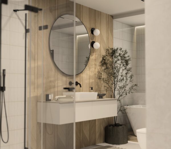 NOWOCZESNOŚĆ I NATURALNE PIĘKNO: CIEPŁE DREWNO I MINIMALISTYCZNE DETALE W ARANŻACJI ŁAZIENKI