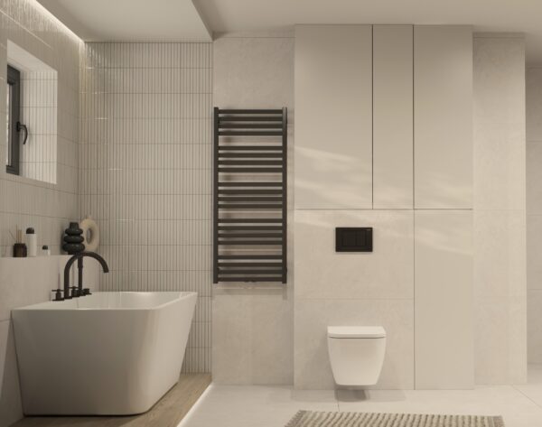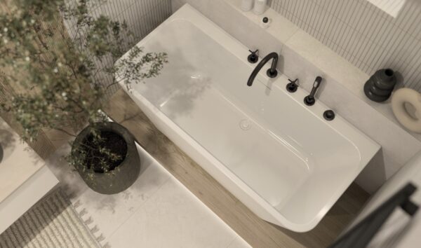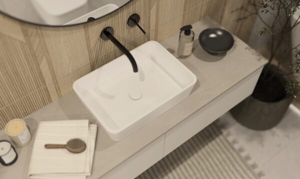 Całość dopełniają LA PLATERA PENCIL KROMO WHITE 35×35, płytki o minimalistycznym wzorze przypominającym cegiełki, które dodają przestrzeni oryginalnego charakteru. Ich różnorodność odcieni wprowadza naturalny efekt, a prostota formy czyni je idealnym wyborem do nowoczesnych wnętrz. Ta kompozycja łączy w sobie nowoczesność z naturalnym pięknem, tworząc łazienkę pełną stylu i funkcjonalności.