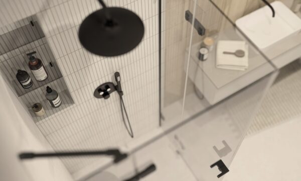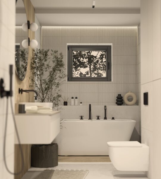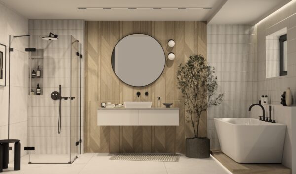 W tej wyjątkowej aranżacji wykorzystano cztery modele płytek, które razem tworzą harmonijną i stylową przestrzeń. Głównym elementem dekoracyjnym są PORCELANOSA 3D ARROW ARCE 59,6×150, których wzór imitujący strzałki dodaje wnętrzu dynamiki i nowoczesności. Te płytki, przypominające drewniane deski, doskonale sprawdzą się na ścianach, wprowadzając ciepło i przytulność. Na podłodze pod wanną zastosowano PORCELANOSA NOBU ARCE ANTISLIP 19,3×180, płytki gresowe o matowym wykończeniu, których antypoślizgowa powierzchnia zapewnia bezpieczeństwo, a jednocześnie dodaje wnętrzu elegancji. Dla większych powierzchni, takich jak strefa prysznica czy ściany wokół wanny, doskonale nadaje się KERABEN VERSE CREAM SOFT 120×60. Płytki te, inspirowane naturalnym kamieniem, wprowadzają subtelność i ponadczasowy wygląd, który sprawdzi się w każdej łazience.