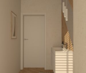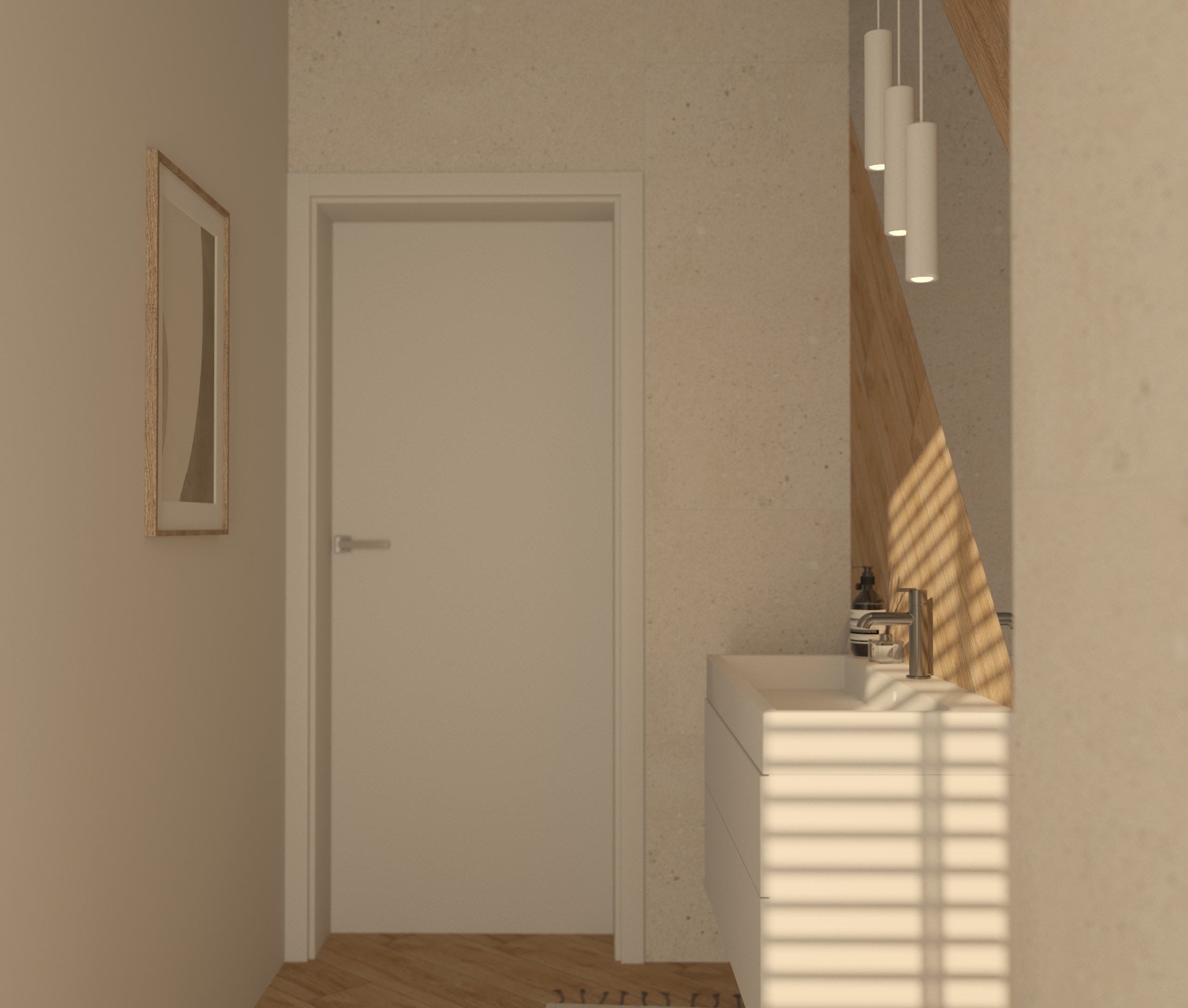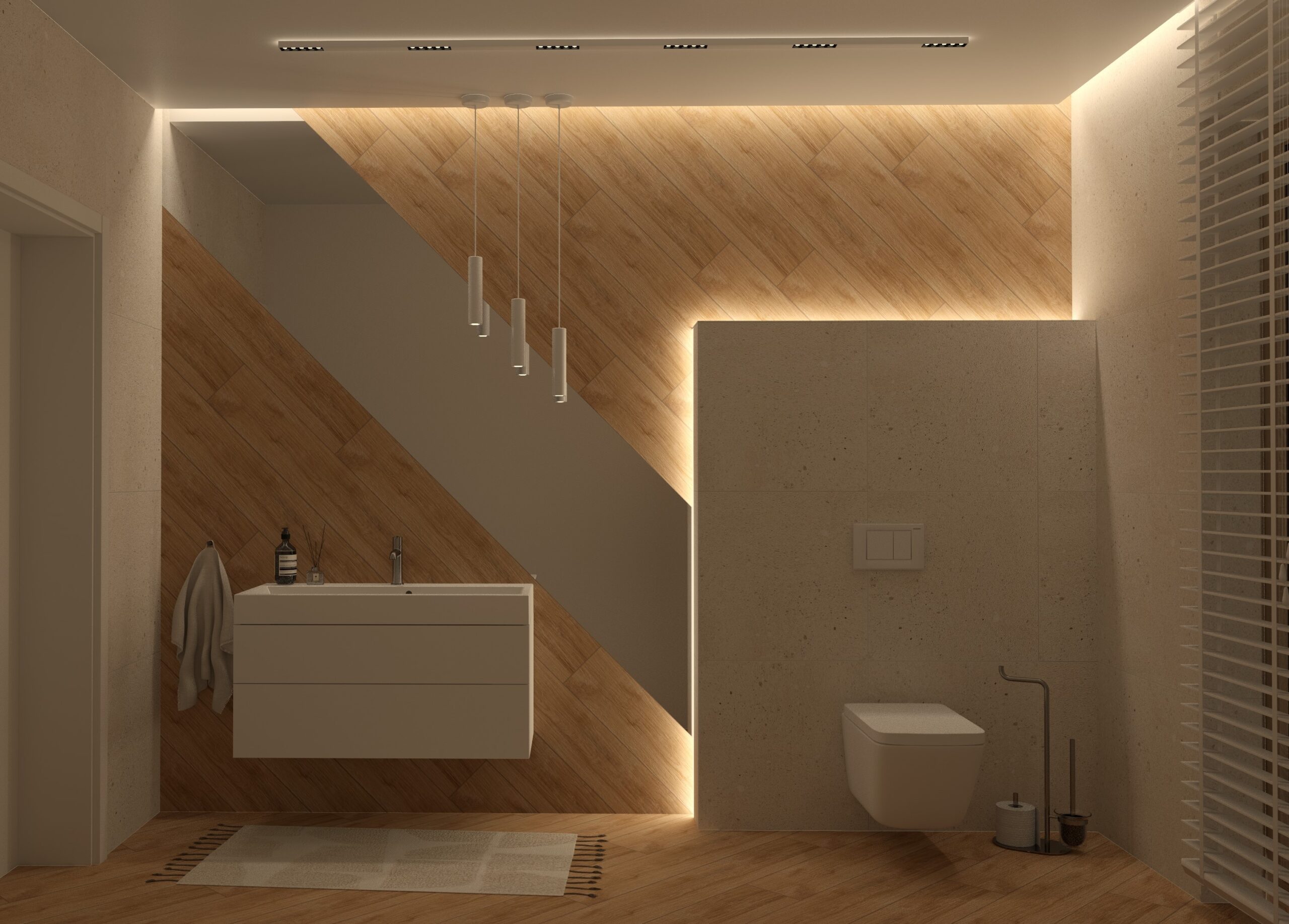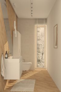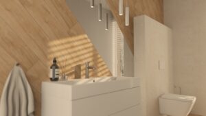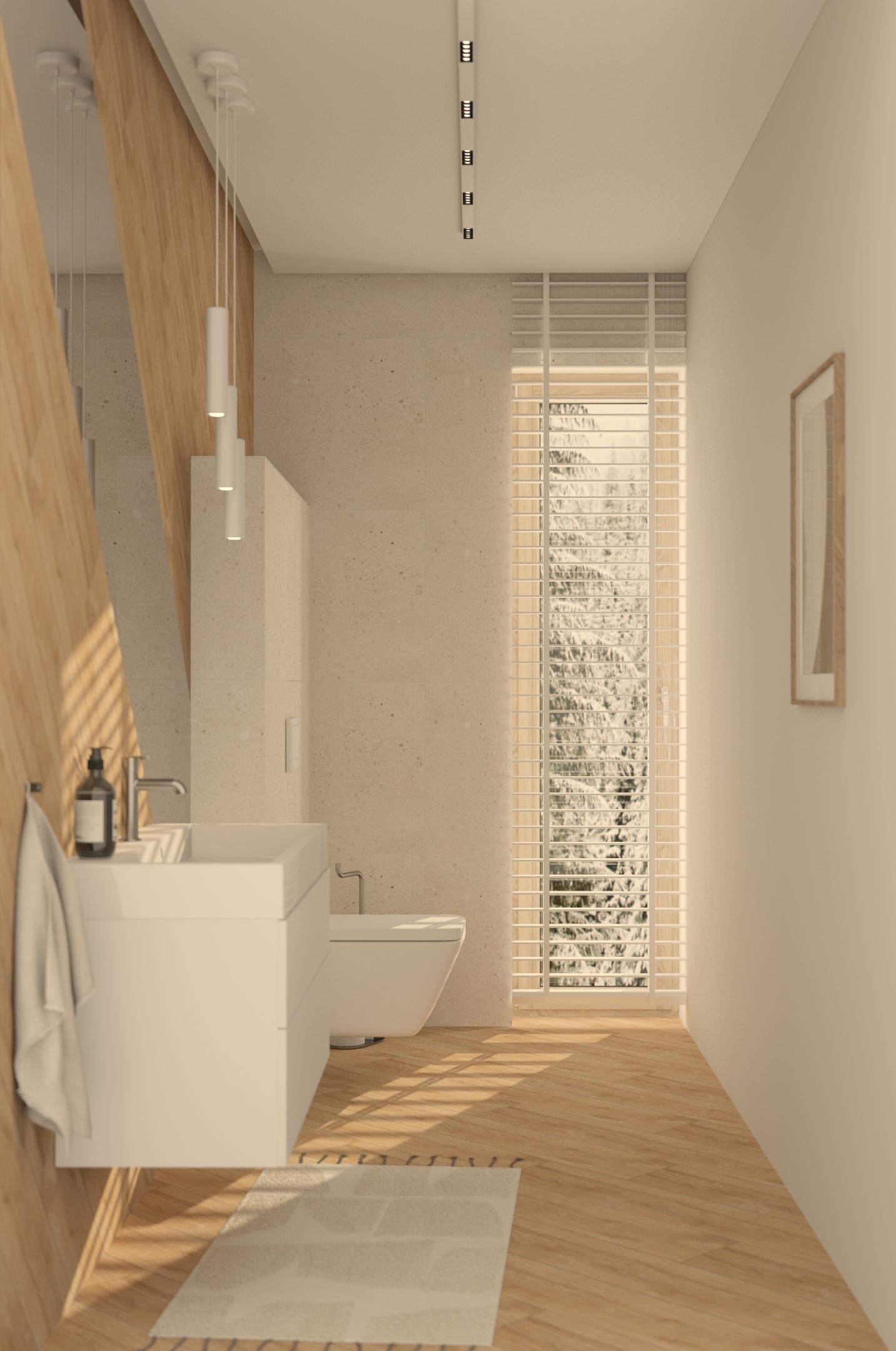 Wizualizacja przedstawia przytulną i funkcjonalną łazienkę, w której dominują stonowane kolory i przemyślany układ, idealny dla niewielkich przestrzeni. Naturalne światło wpada przez małe okno, subtelnie oświetlając wnętrze i podkreślając jego elegancję. Ściany zdobią płytki Porcelanosa Ruggine Platino, których matowo-błyszczący szary metaliczny efekt nadaje przestrzeni nowoczesności i subtelnego połysku.... Czytaj dalej