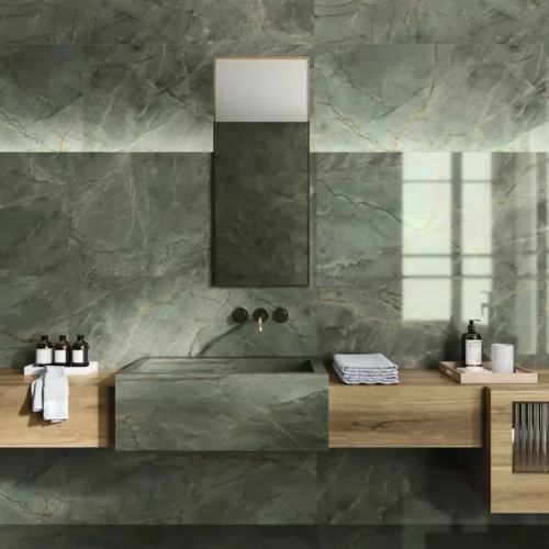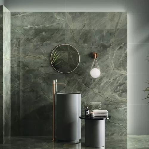 Kolekcja Jadore inspirowana jest jadeitem, minerałem cenionym za swoją unikalną kolorystykę i trwałość. Subtelne wzory na powierzchni płytek przywodzą na myśl harmonię i elegancję, sprawiając, że wnętrza stają się bardziej przestronne i luksusowe.