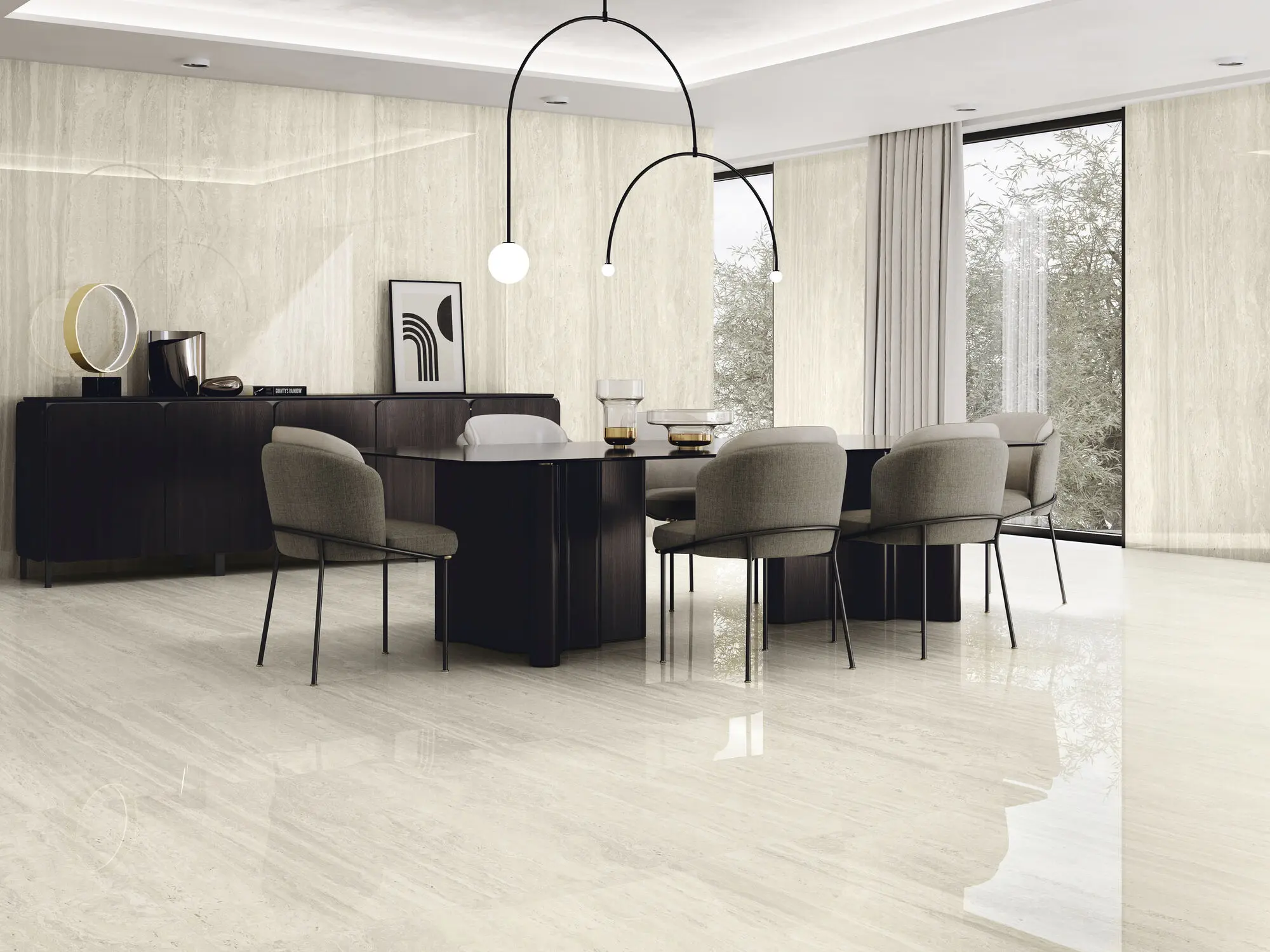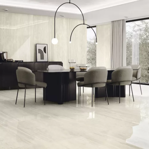 Dzięki wielkoformatowej konstrukcji, doskonale sprawdzi się zarówno na podłogach, jak i ścianach, tworząc harmonijną i nowoczesną przestrzeń. Lustrzany połysk subtelnie odbija światło, potęgując efekt luksusu.