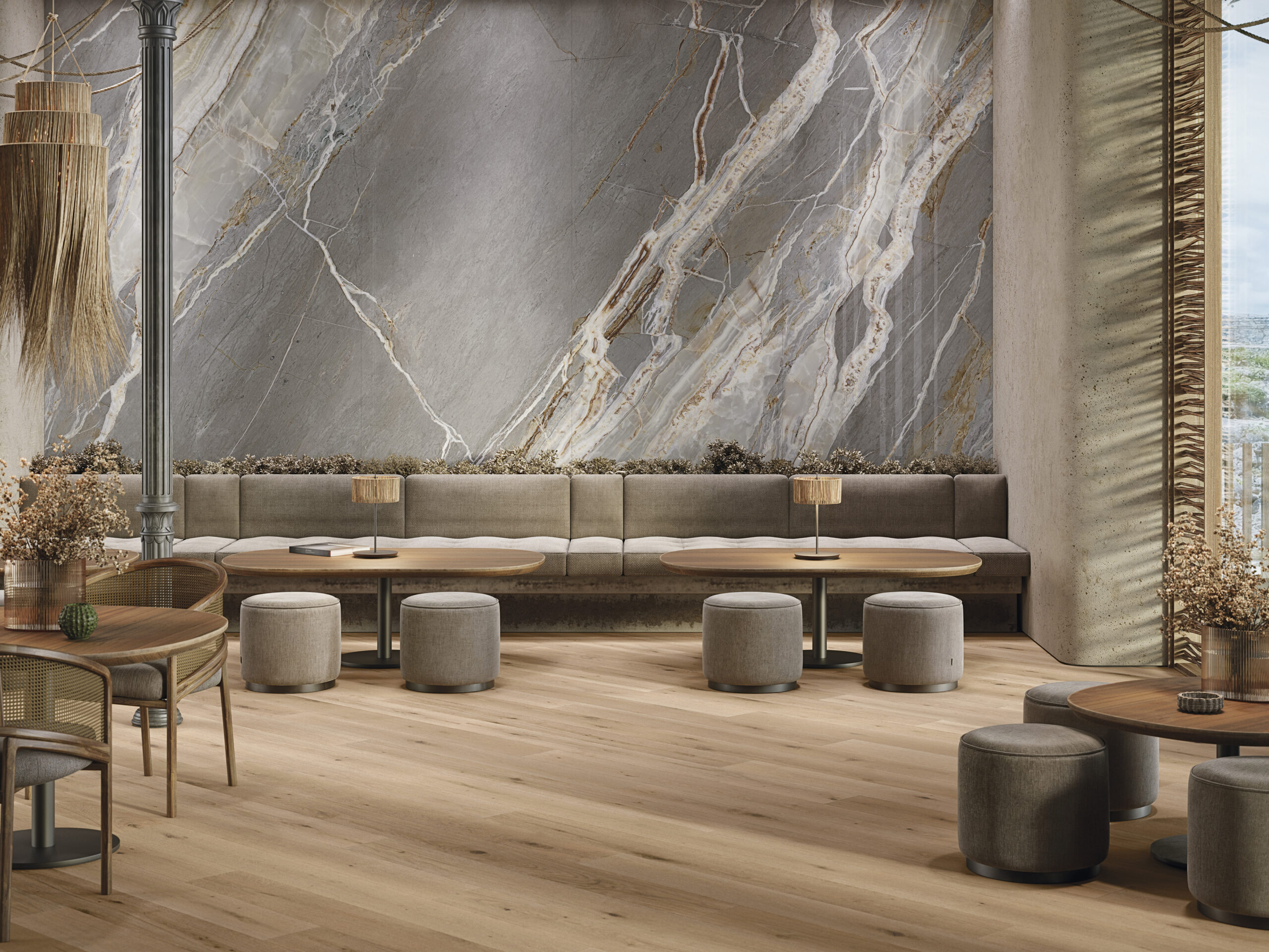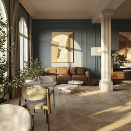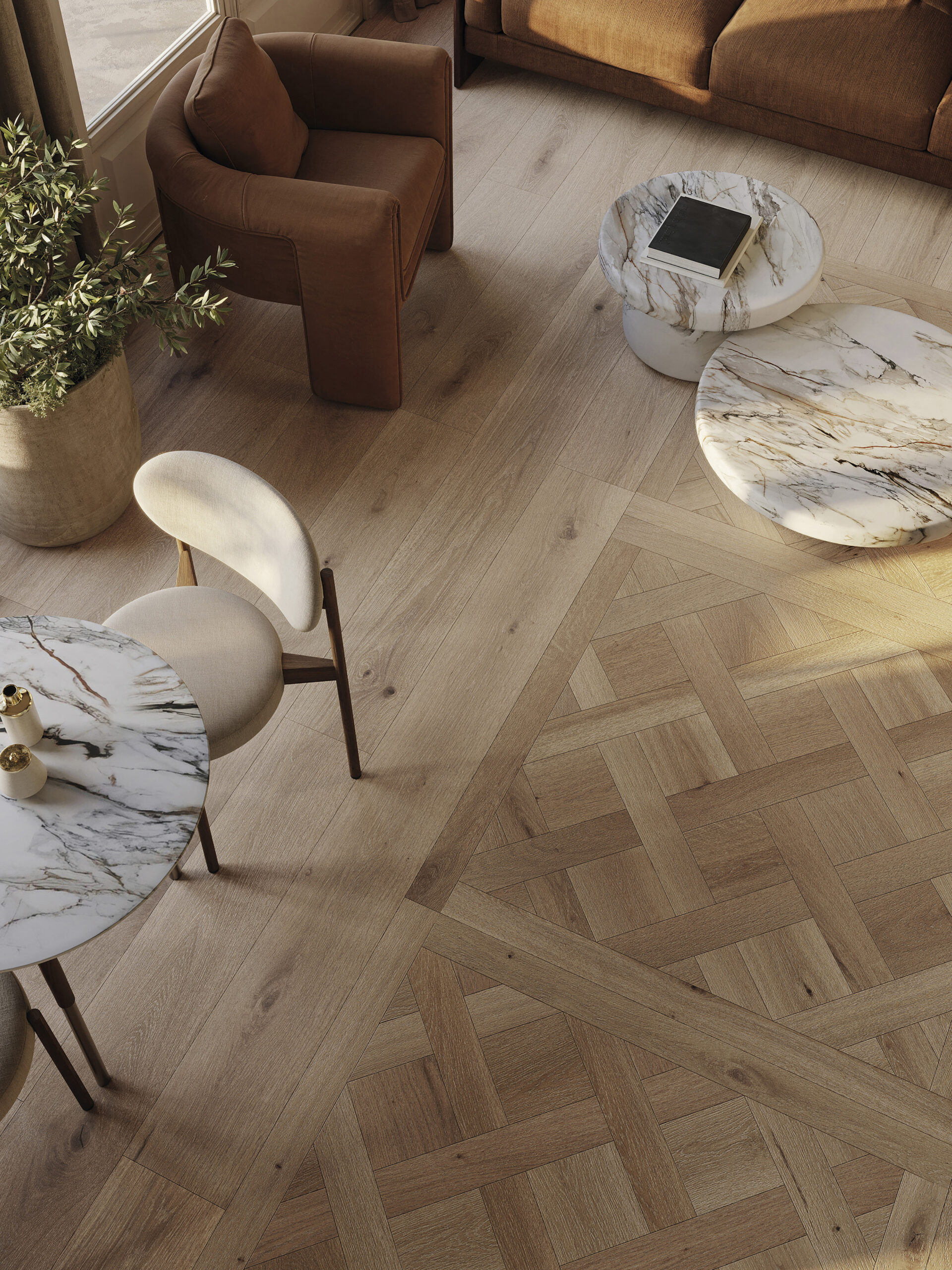 Gres porcelanowy PAR-KER® o realistycznym efekcie naturalnego drewna w ciepłych odcieniach (Roble, Arce, Nogal, Sand, Olivo) i długich formatach desek. Matowa, autentyczna powierzchnia – idealna, trwała baza do ciepłych i eleganckich wnętrz.