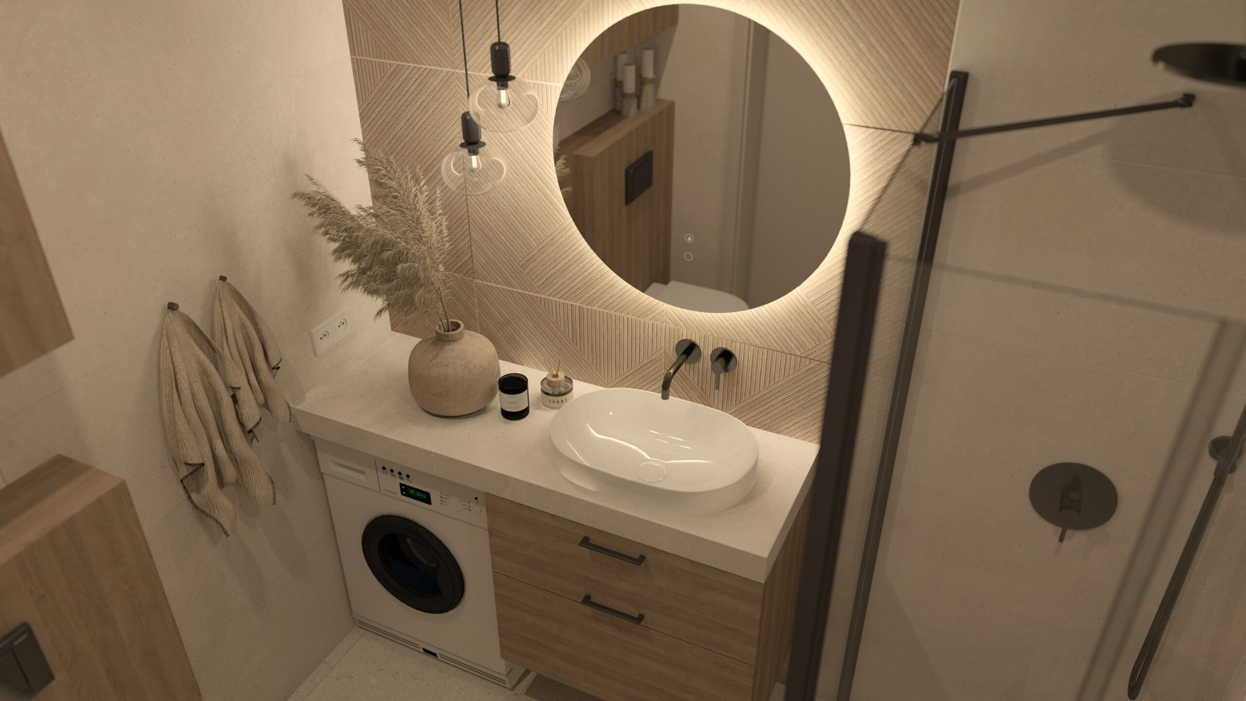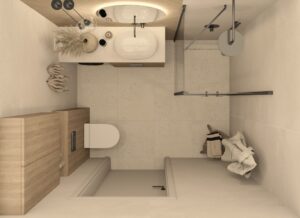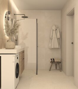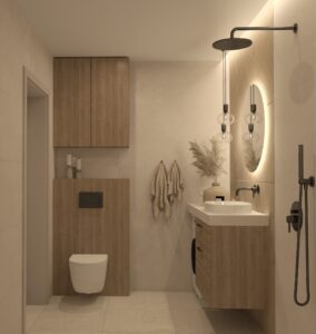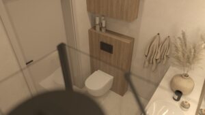 Wizualizacja przedstawia przytulną i funkcjonalną łazienkę, w której dominują stonowane kolory i przemyślany układ, idealny dla niewielkich przestrzeni. Naturalne światło wpada przez małe okno, subtelnie oświetlając wnętrze i podkreślając jego elegancję. Ściany zdobią płytki Porcelanosa Ruggine Platino, których matowo-błyszczący szary metaliczny efekt nadaje przestrzeni nowoczesności i subtelnego połysku.... Czytaj dalej