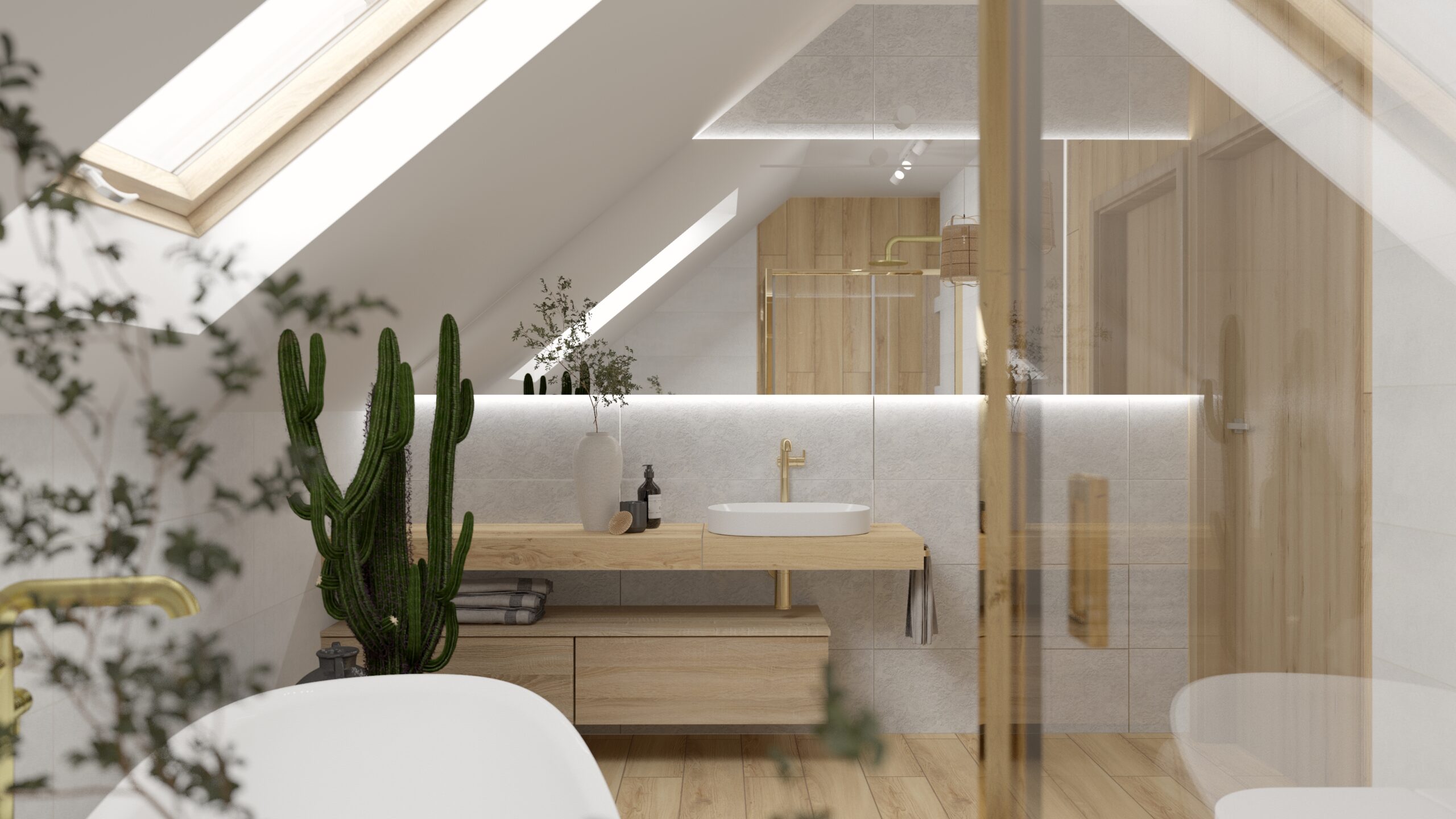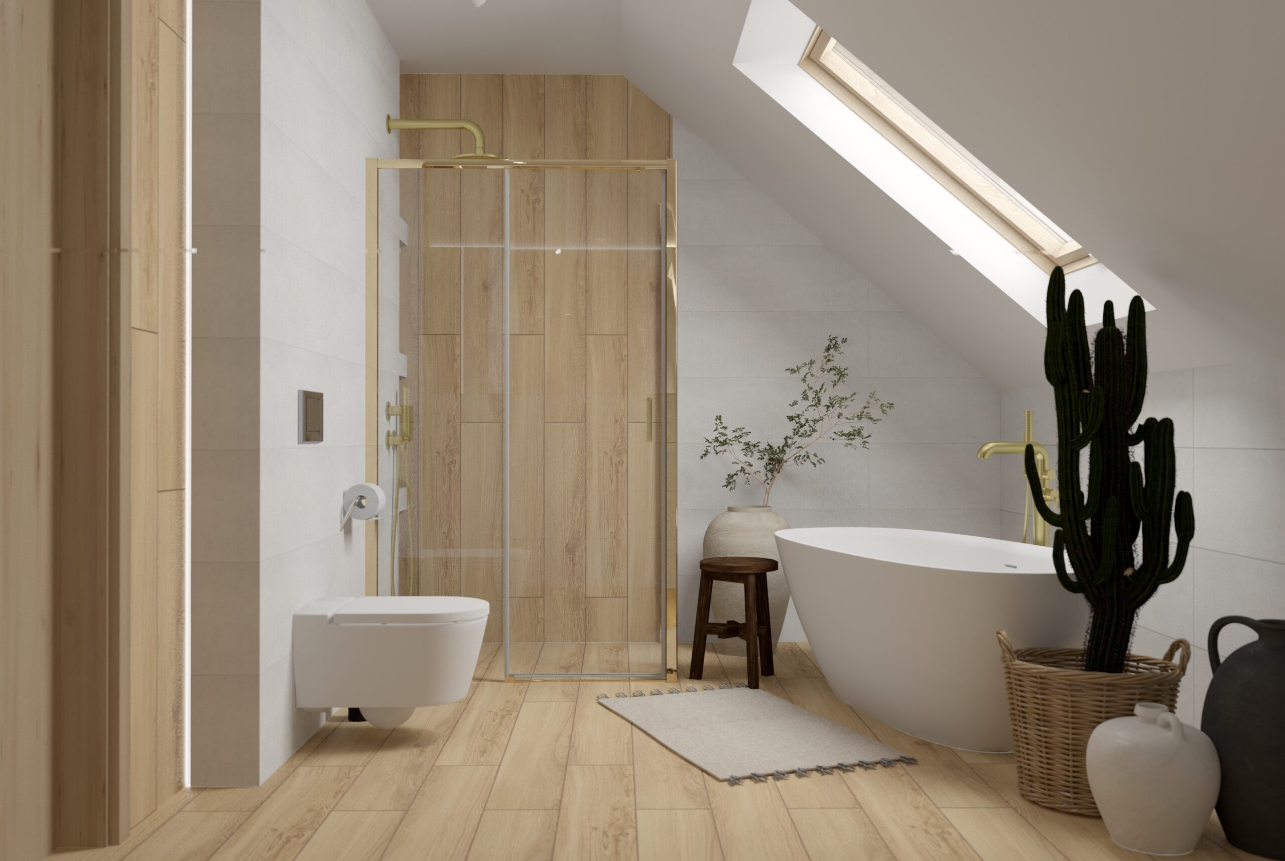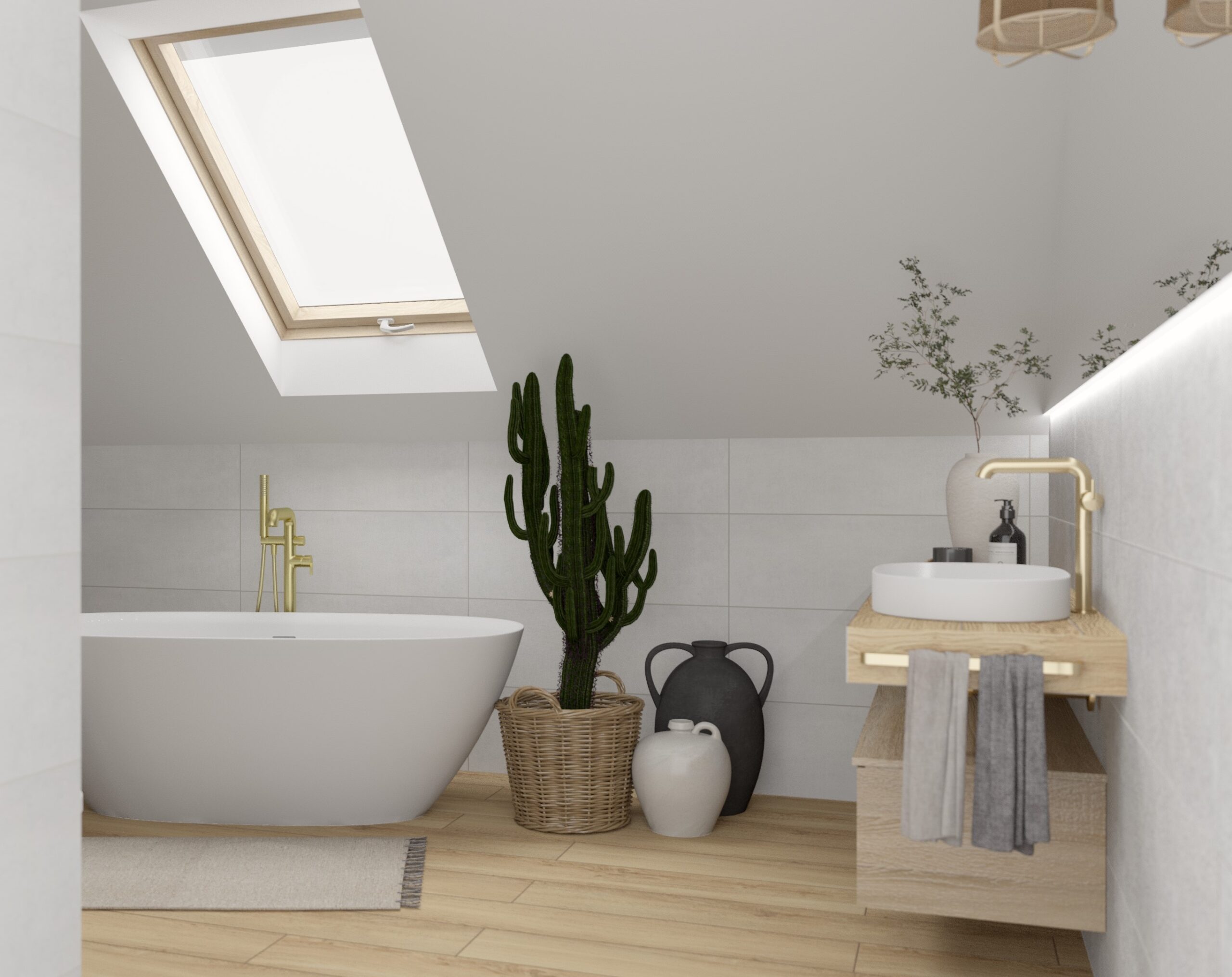 Wizualizacja przedstawia przytulną i funkcjonalną łazienkę, w której dominują stonowane kolory i przemyślany układ, idealny dla niewielkich przestrzeni. Naturalne światło wpada przez małe okno, subtelnie oświetlając wnętrze i podkreślając jego elegancję. Ściany zdobią płytki Porcelanosa Ruggine Platino, których matowo-błyszczący szary metaliczny efekt nadaje przestrzeni nowoczesności i subtelnego połysku.... Czytaj dalej